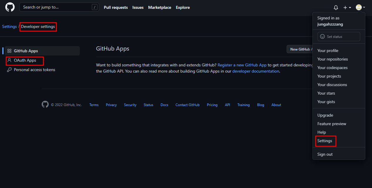 3-1. 깃허브 접속 후 Settings - Developer Settings 에서 App을 등록해 준다.