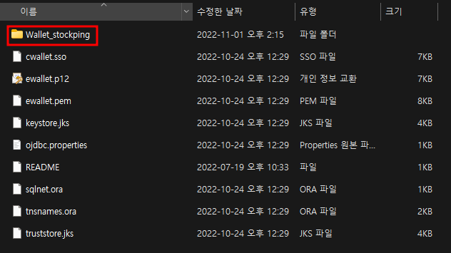 2. instantclient_버전 폴더 / network / admin 경로에 오라클 클라우드 생성 시 발급받은 전자지갑 파일을 압축 해제하여 넣어주어야 한다! (중요)