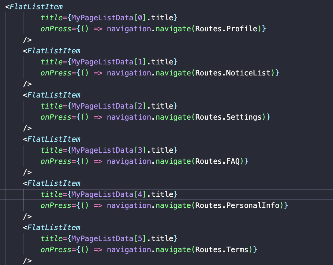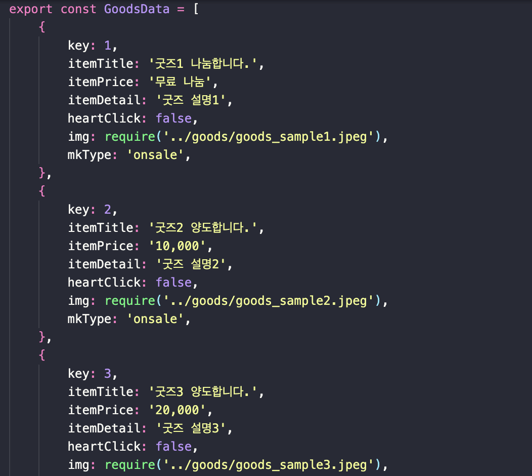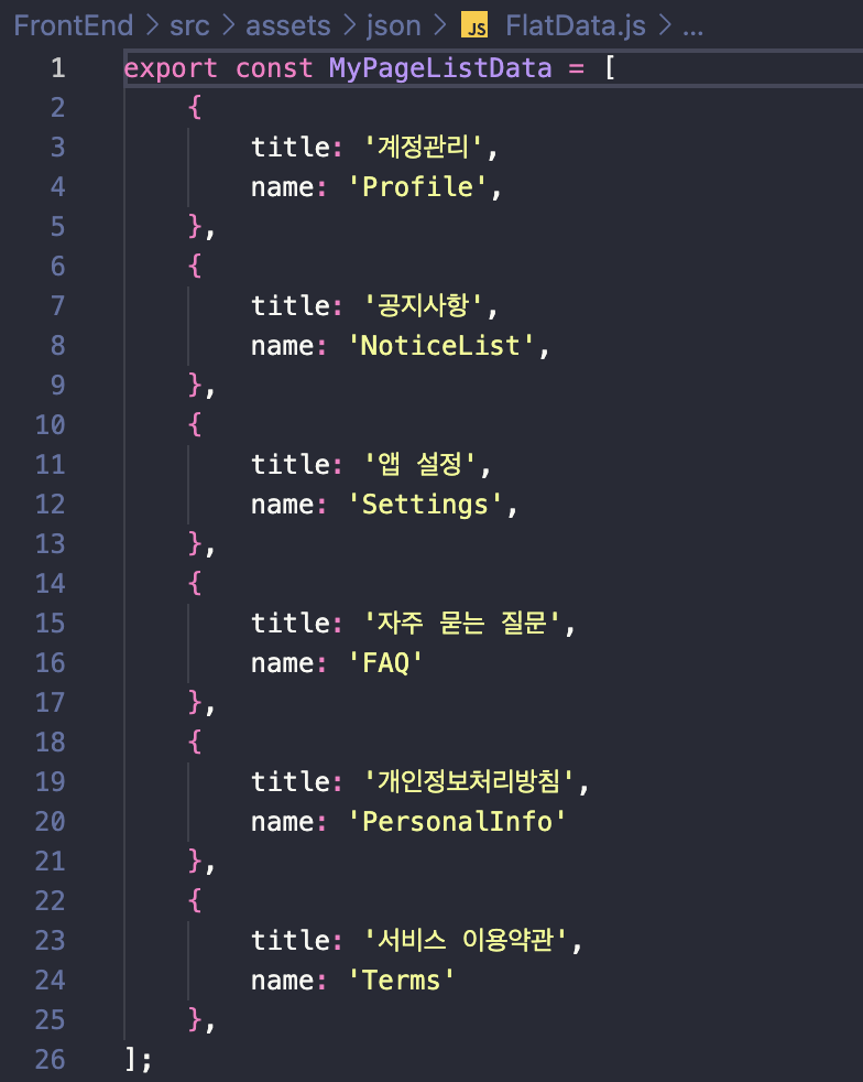 1. 일단 FlatData라는 이름으로 json 파일을 만들고 (아직은 백엔드 DB작업이 끝나지 않았기 때문에 임시로 생성한 데이터) 각 화면에서 위 데이터를 FlatList의 data로 불러왔다.
