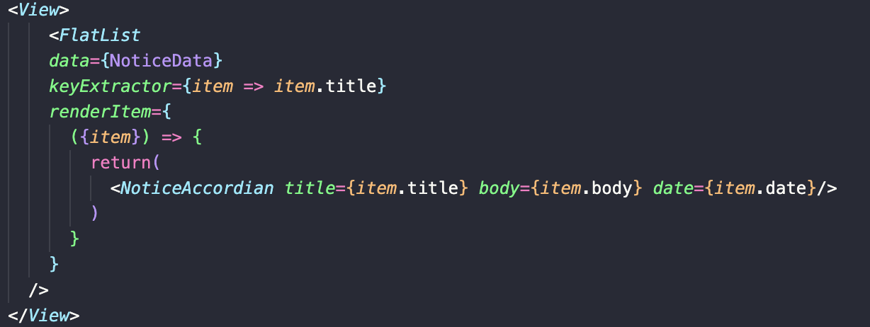 - data, renderItem 두 가지 prop만 이해하면 된다. data는 리스트 소스를 담는 prop, renderItem은 data로 받은 소스들 그 각각의 item을 랜더시켜주는 콜백함수이다.