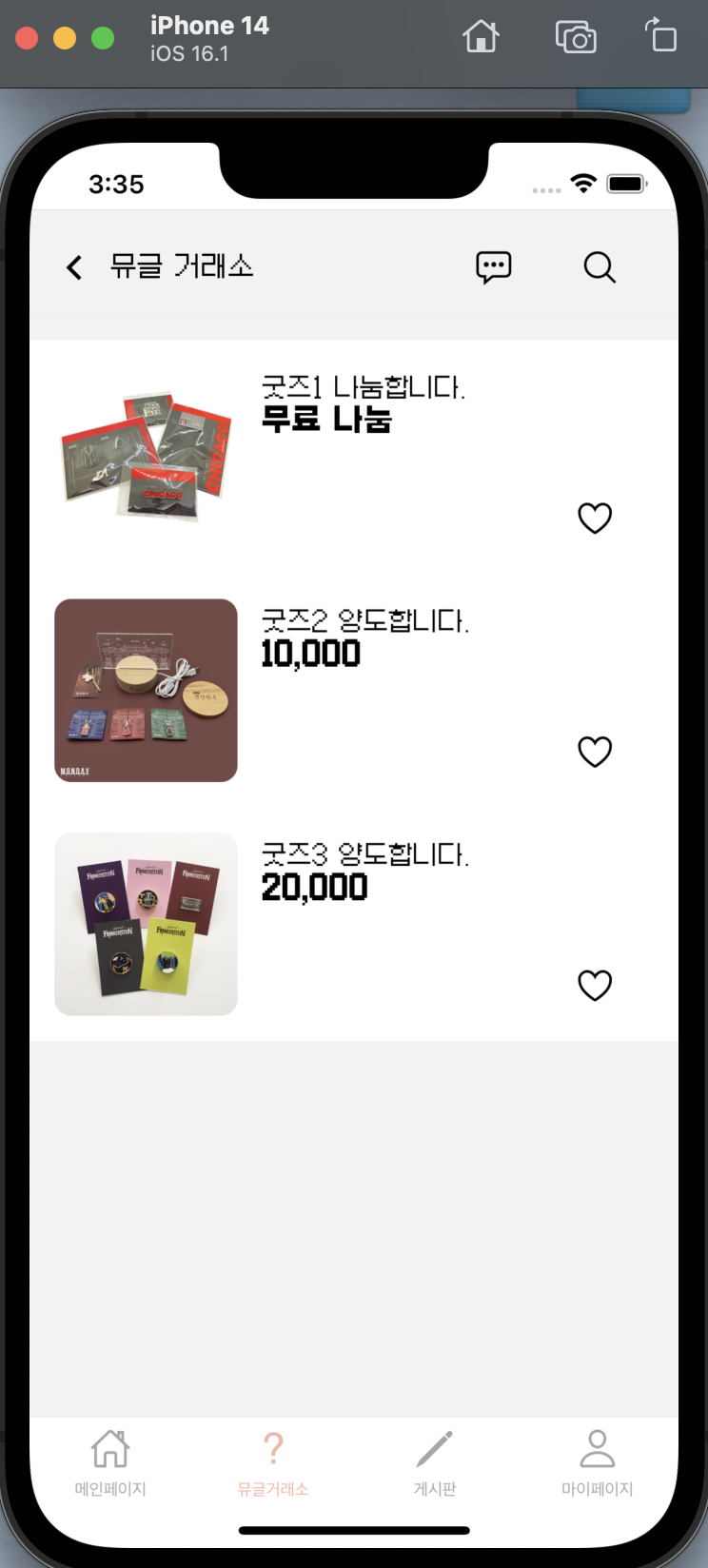 나는 이번 프로젝트 UI중 여러 목록이 필요한 화면에 FlatList를 사용할 것이다. (게시판 글 목록 등등) 지금까지 개발한 화면 중 마이페이지, 공지사항, 굿즈 거래소 총 3가지 화면에 FlatList 컴포넌트를 활용했다.