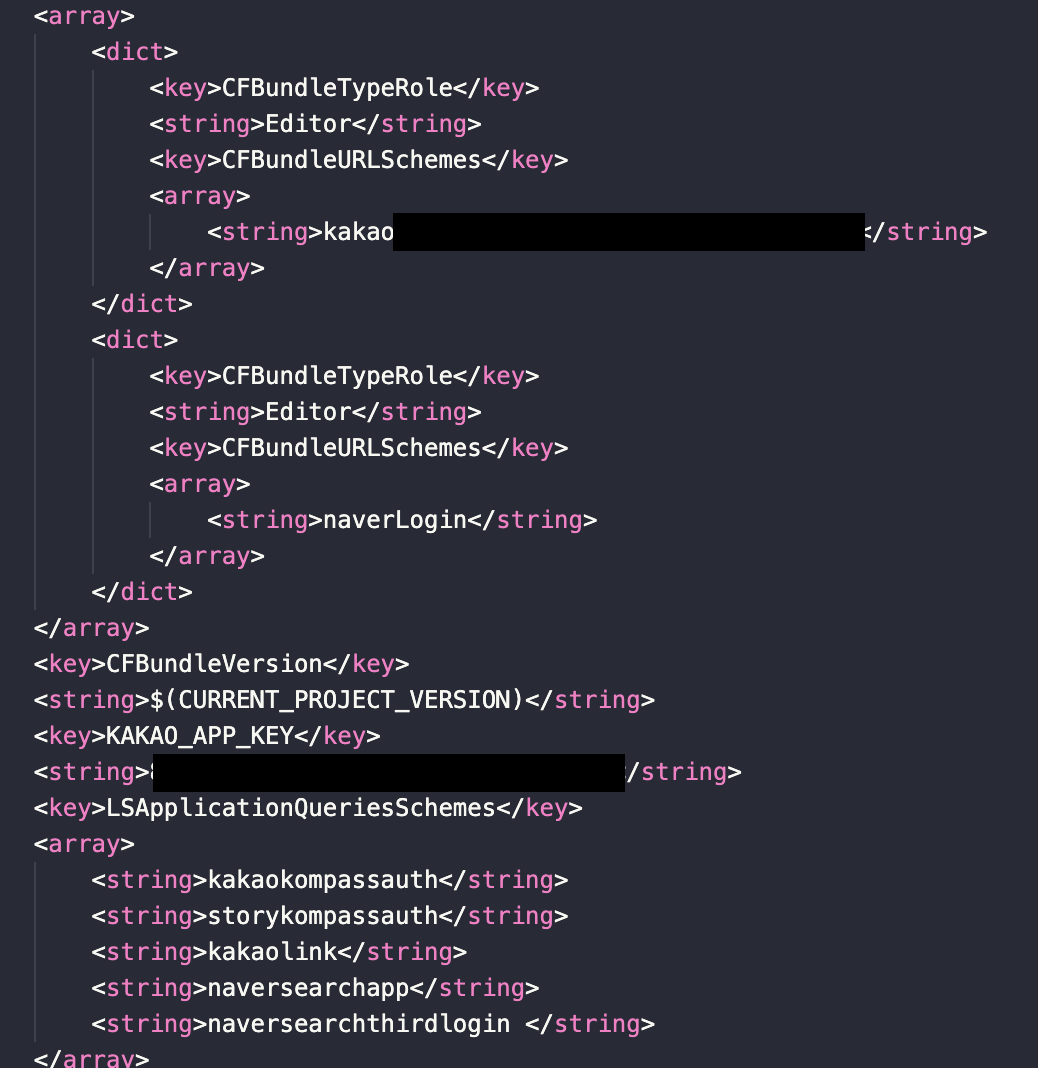 + <key>KAKAO_APP_SCHEME</key> // 선택 사항 멀티 플랫폼 앱 구현 시에만 추가하면 됩니다