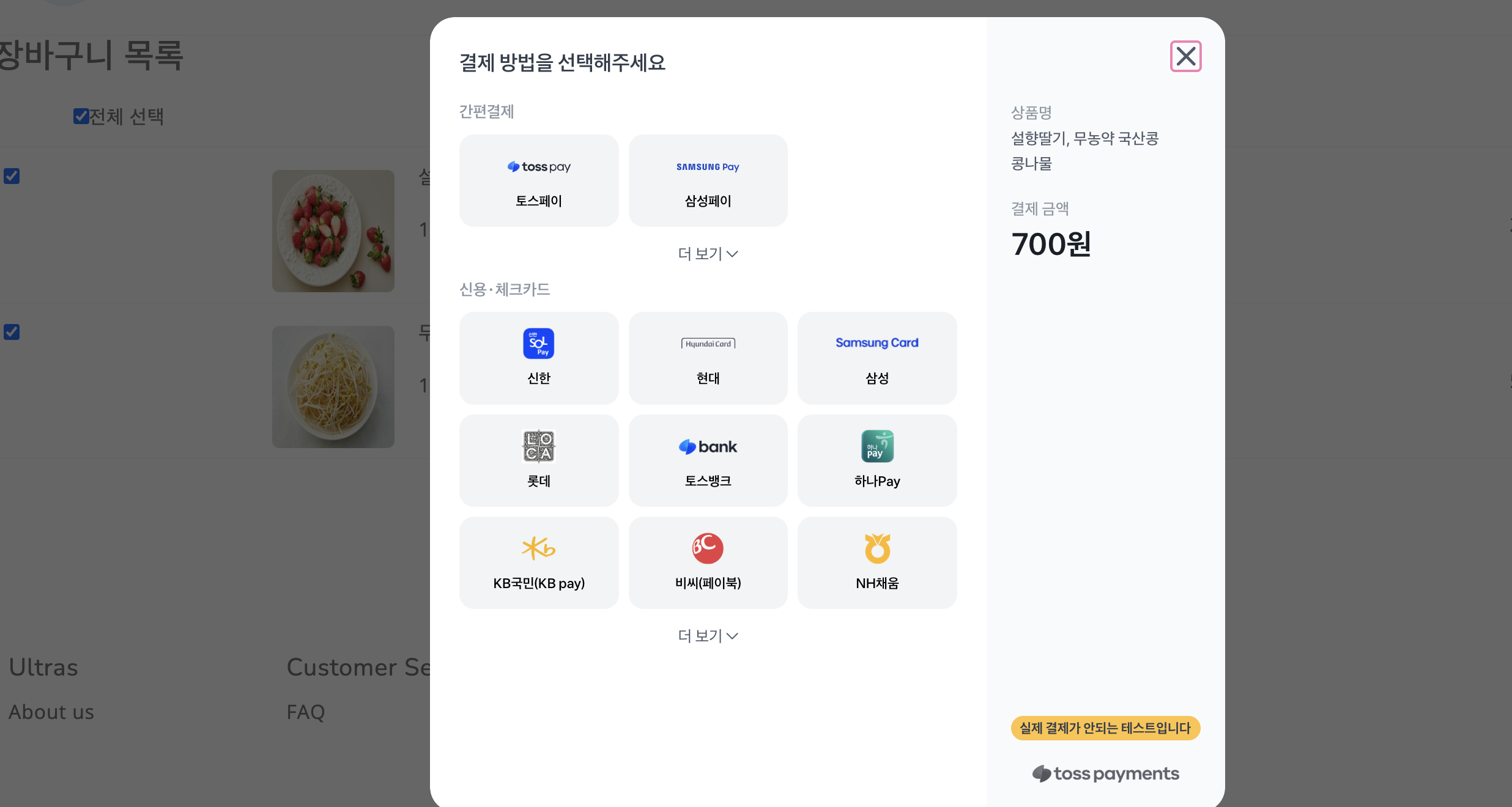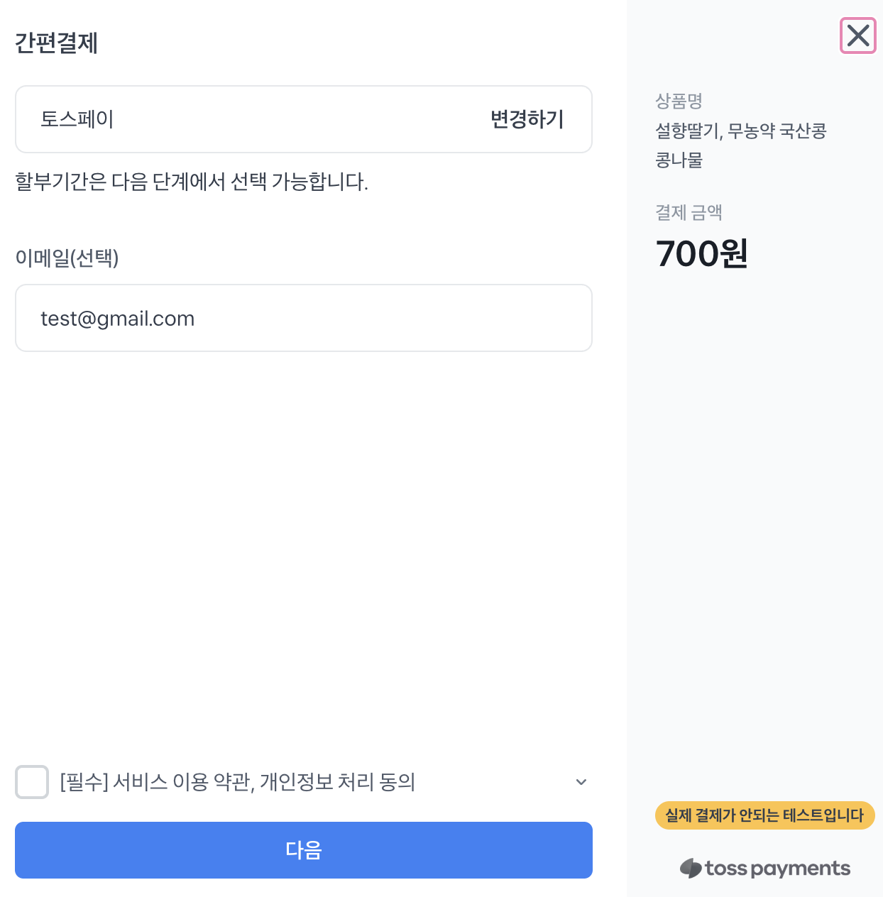 테스트키를 사용하면 실제 결제는 이뤄지지 않는다.