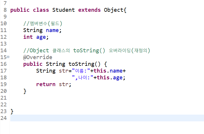 -모든 클래스는 Object 클래스를 상속받는다. =>최상위 슈퍼 클래스, extends Object 가 항상 생략되어 있다고 생각하면 됨.