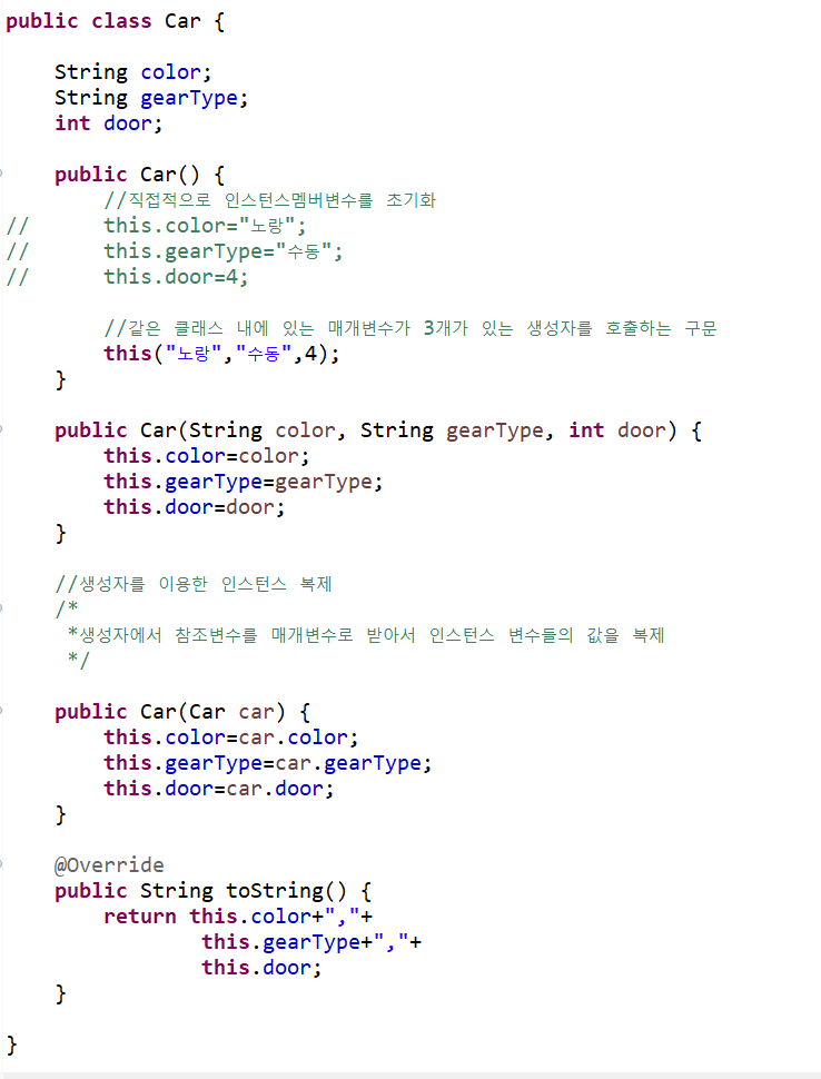 2.this : 참조 변수와 같은 역할(자기 자신을 가리킴), 매개 변수와 인스턴스멤버변수를 구분짓는데 사용.