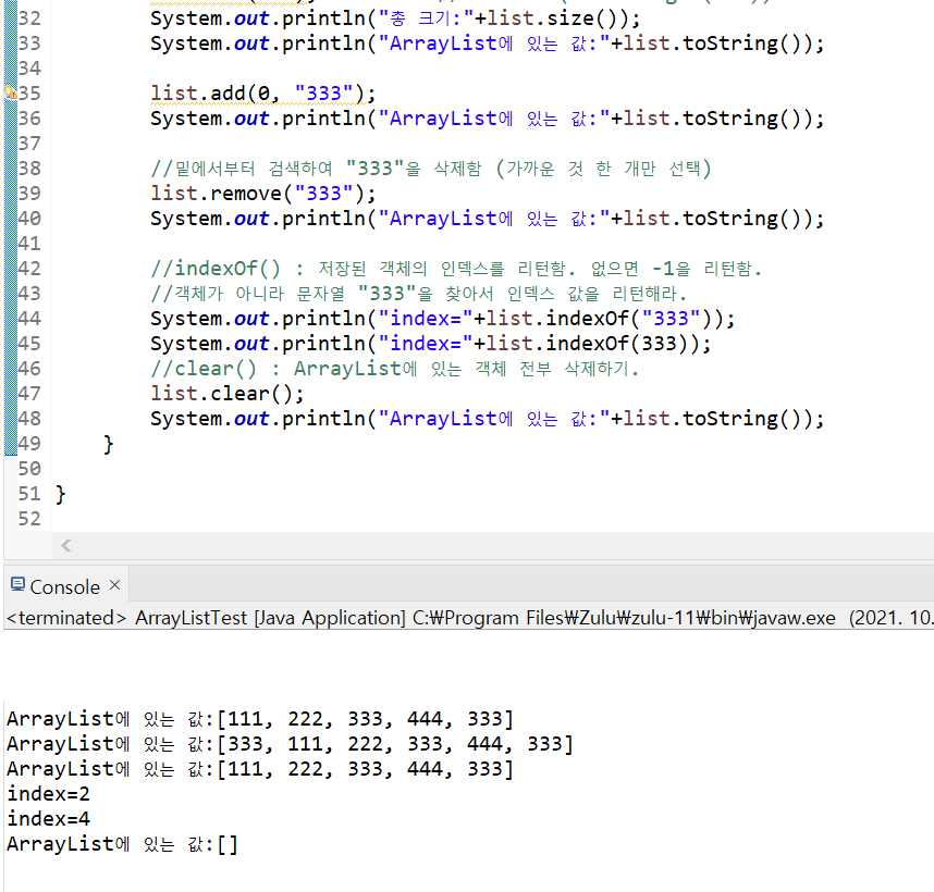 -E remove (int index) : 배열의 인덱스 위치에 있는 요소 값을 제거하고 그 값을 반환함.