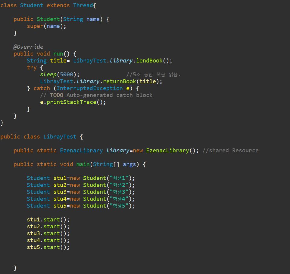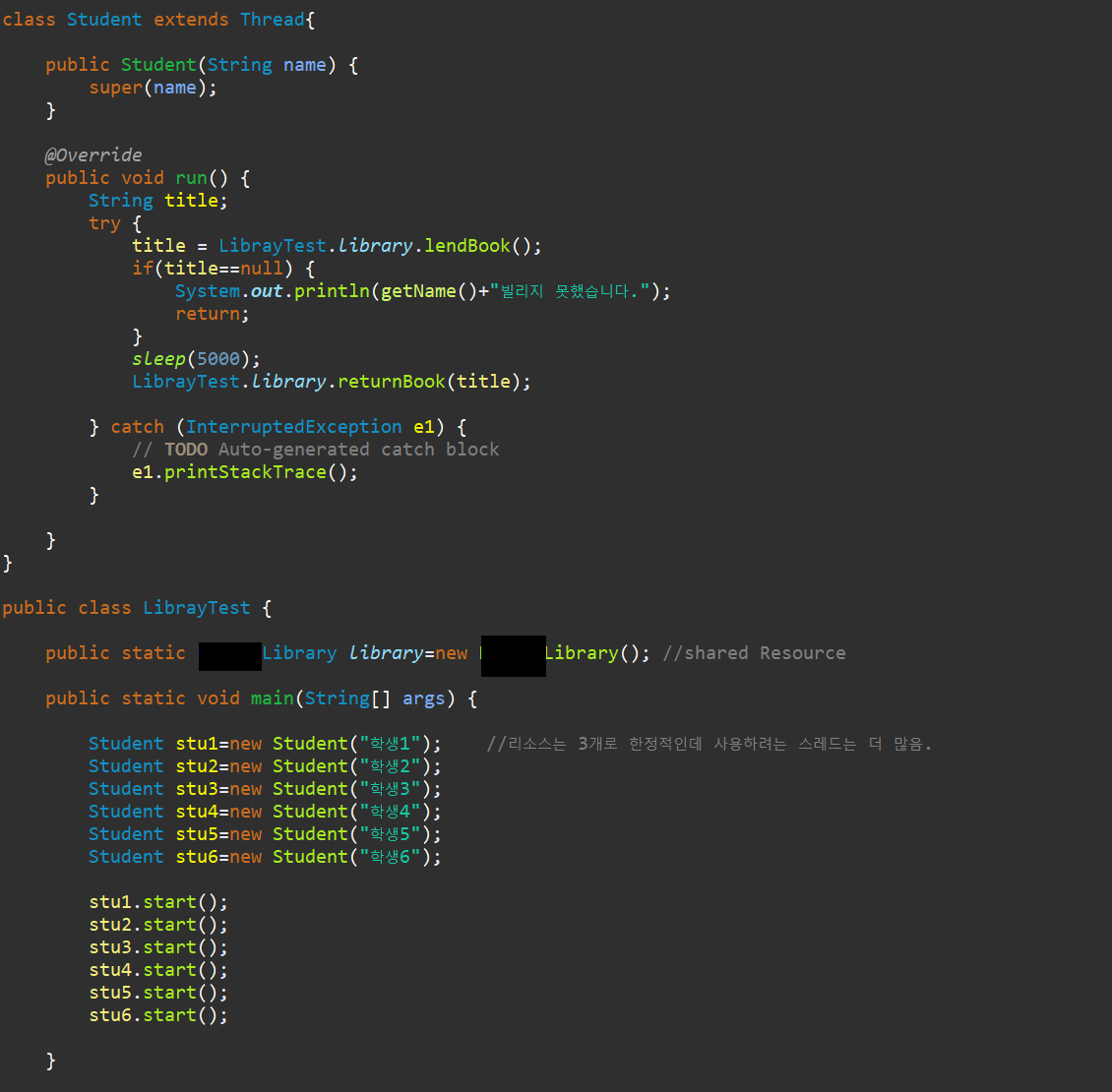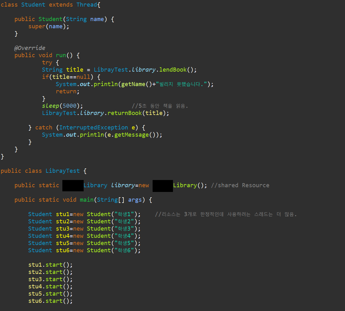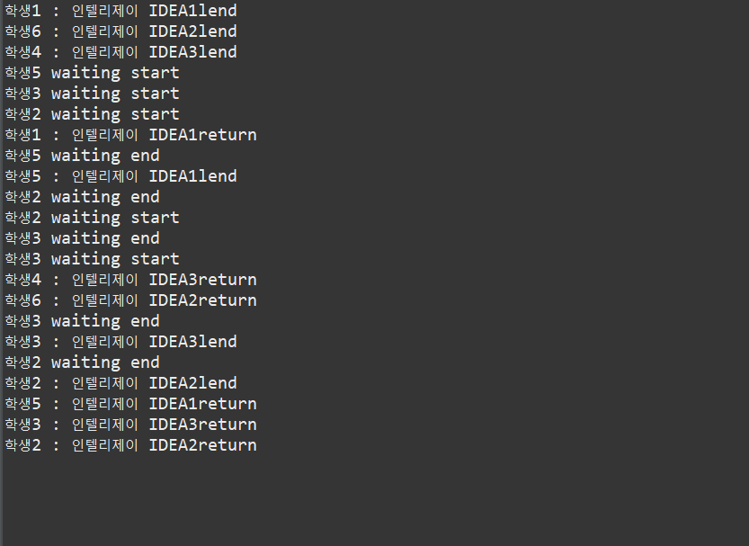 예제2. 학생은 6명, 책은 3권 -> 책을 못빌릴 경우에는 wait()을 호출하여 기다림.