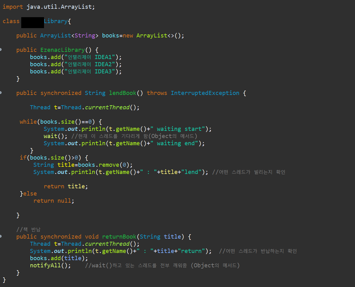 책이 반납되어 빌릴 수 있게 될 경우 깨워주는 게 notifyAll()임.
