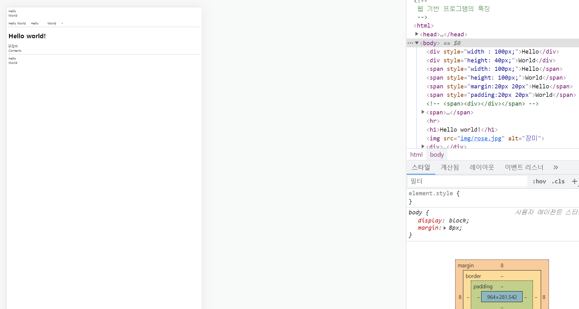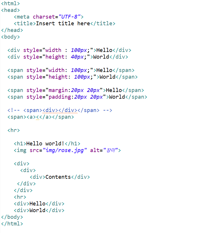 -인라인(Inline) 요소 : 글자를 만들기 위한 요소들. (--->대표적으로 <span>)