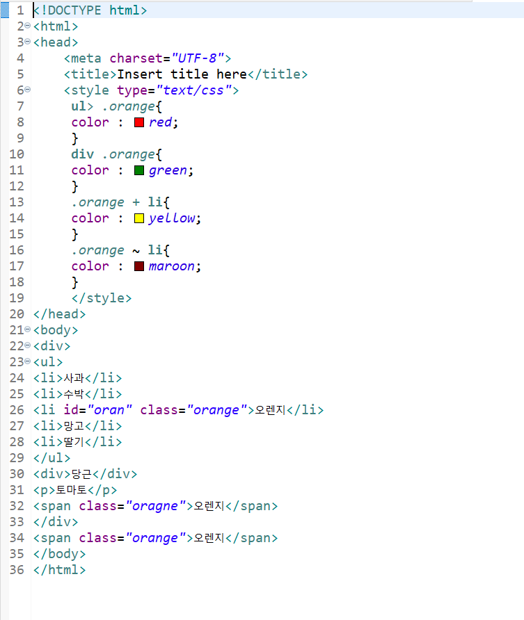 .orange ~ li : 클래스 orange의 다음 형제 요소 li 모두 선택