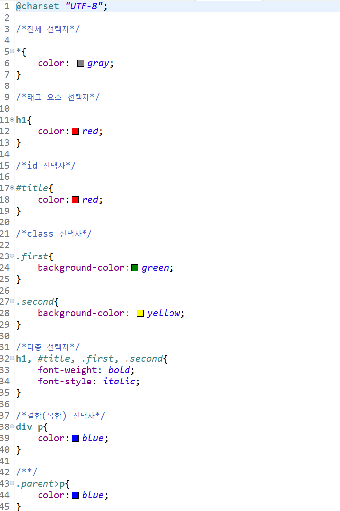 선택자 { <--스타일 범위의 시작