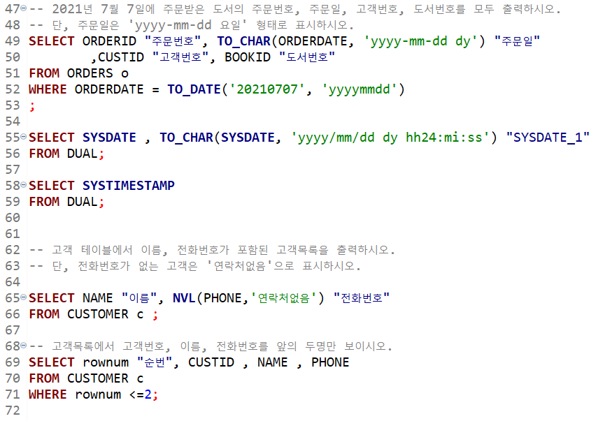 2) NVL(속성, 값) : 속성 값이 null이면 '값'으로 대치함.