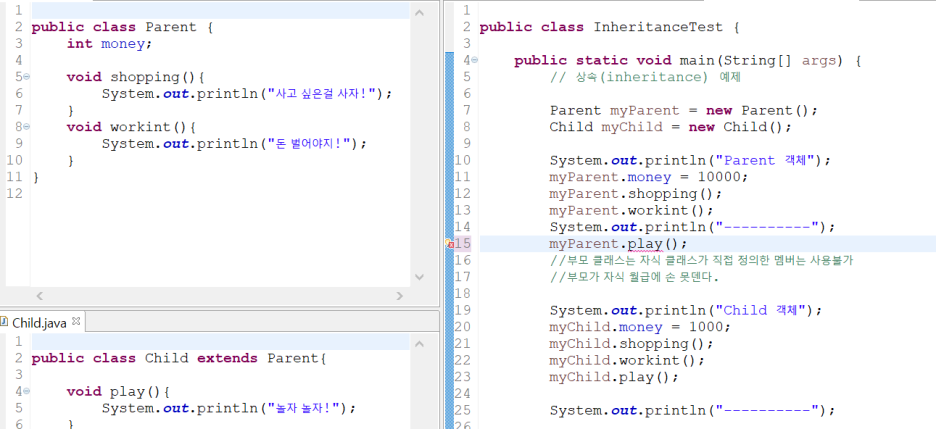 -자식 클래스는 부모 클래스가 가진 재산(변수, 메서드 등등)을 물려받아서 사용 가능하다. -> 코드의 재사용이 가능하다!!