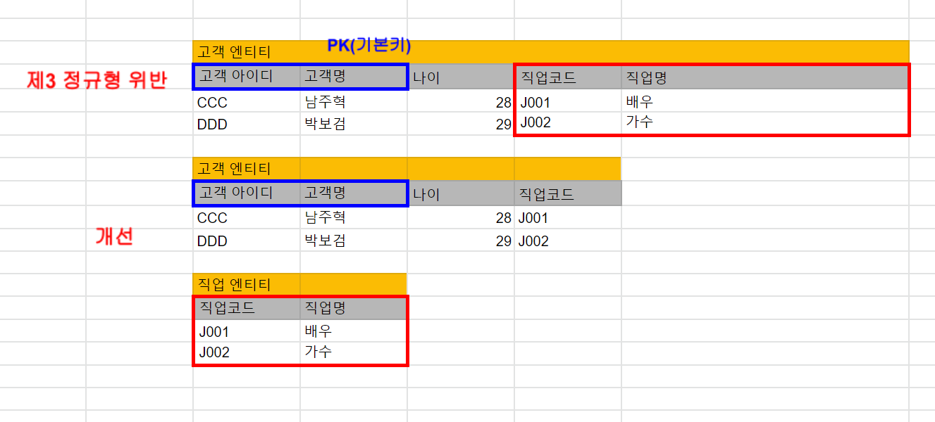 =>일반 속성(컬럼)인 직업코드에 함수 종속이 존재함.(제3정규형 위반)