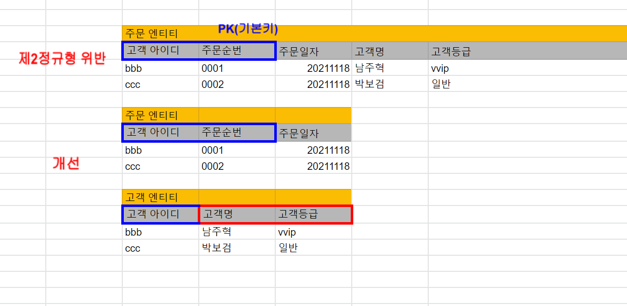 2)기본키에 종속적이지 않거나 기본키 일부 컬럼(들)에만 종속적인 컬럼은 분리되어야 함.