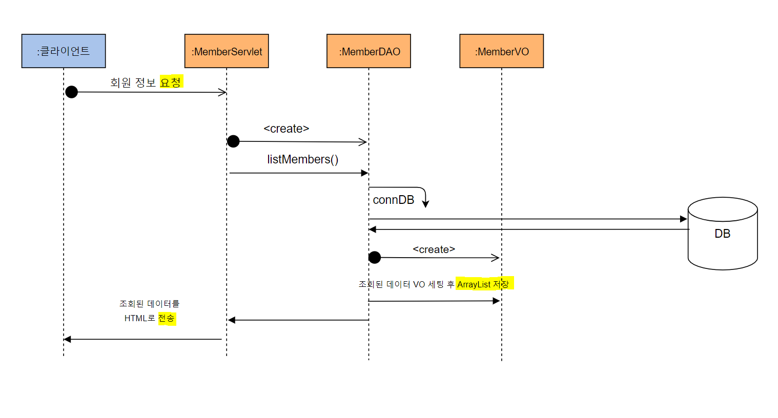List<MemberVO> list= dao.listMembers(); //listMembers() 메서드로 회원 정보를 조회함.