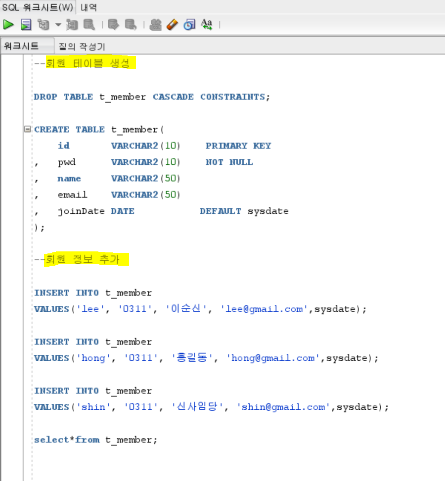 0) 회원 테이블 t_member 생성, 회원 정보 추가