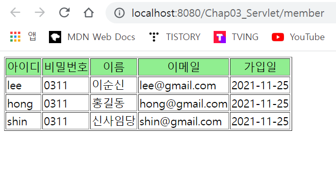 1)웹 브라우저가 서블릿에게 회원 정보 요청