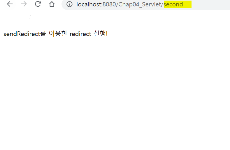 response.sendRedirect("second"); //웹 브라우저에게 다른 서블릿인 second로 재요청함.
