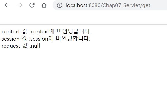 -각 서블릿 API의 setAttribute(String name, Object Value)로 바인딩함.