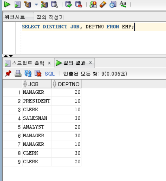 ->DISTINCT 키워드는 하나의 컬럼이 아니라 SELECT절에 명시된 모든 컬럼의 데이터 중복을 제거하는 역할을 한다.
