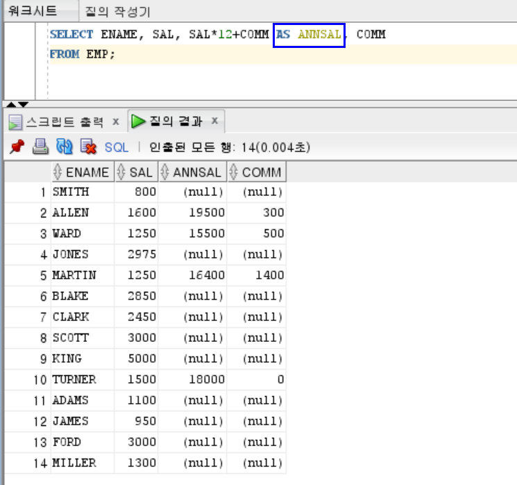 'AS ANNSAL'키워드를 붙이면 별칭을 지정해서 출력할 수 있다.