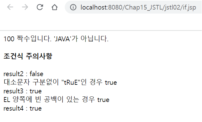--> <c:set>에서 string을 JSP로 선언했기 때문에 JSP == JAVA 는 false이기 때문에 출력되지 않음!